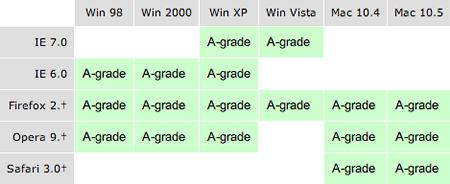 本框架代碼適用于所有由yahoo評為A級(A-grade)的瀏覽器。本文發(fā)文時間,yahoo對瀏覽器的評定情況如下圖所示。