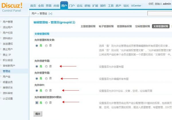 允許被授權管理文章:設置是否允許管理員給此用戶組單個成員分配管理一個或多個頻道欄目文章的權限,需進入頻道欄目進行單獨設置;允許創建專題:設置是否允許創建專題;允許管理專題:設置是否允許編輯所有專題;允許DIY:設置是否允許DIY論壇,文章,空間,論壇等頁面;允許被授權管理DIY模塊:設置是否允許管理員給此用戶組分配管理DIY模塊的權限,包括首頁、頻道、專題、文章、空間、論壇等頁面的權限,需進入頻道管理,專題管理,DIY頁面管理進行分別設置。