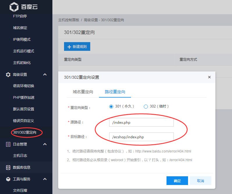 配置路徑重定向 點擊左側導航“高級設置->301/302重定向”,點擊“新建規則”。 選擇重定向類型為“路徑重定向”,輸入源路徑、目標路徑,點擊“確定”。 查看重定向規則列表,可以看到新增一條規則。此時通過瀏覽器訪問指定頁面,可以發現頁面將自動跳轉至目標頁面。